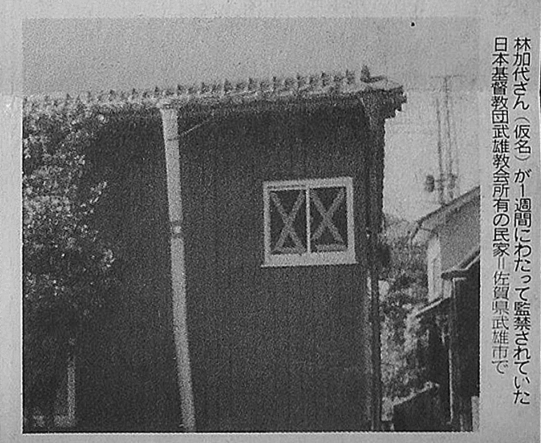 加代さんが連れて行かれた先は、佐賀県武雄市にある日本キリスト教団武雄教会(小林健志 牧師)に隣接した平屋建ての民家だった。すべての窓は外からしっかり固定され、また入り口も外からしか開かないようになっていた。ここは武雄教会の所有で小林牧師が独身時代住んでいた住居である。