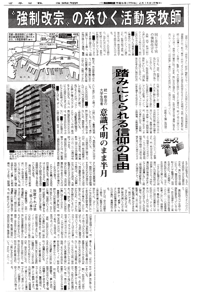 当時大学生のOさんは、監禁された神戸の6階マンションのベランダから、下の階に逃げようとして10数メートル下まで転落してしまいます。このマンションは、ほかの教会員も過去、強制改宗された「改宗部屋」の一つだったと言います。