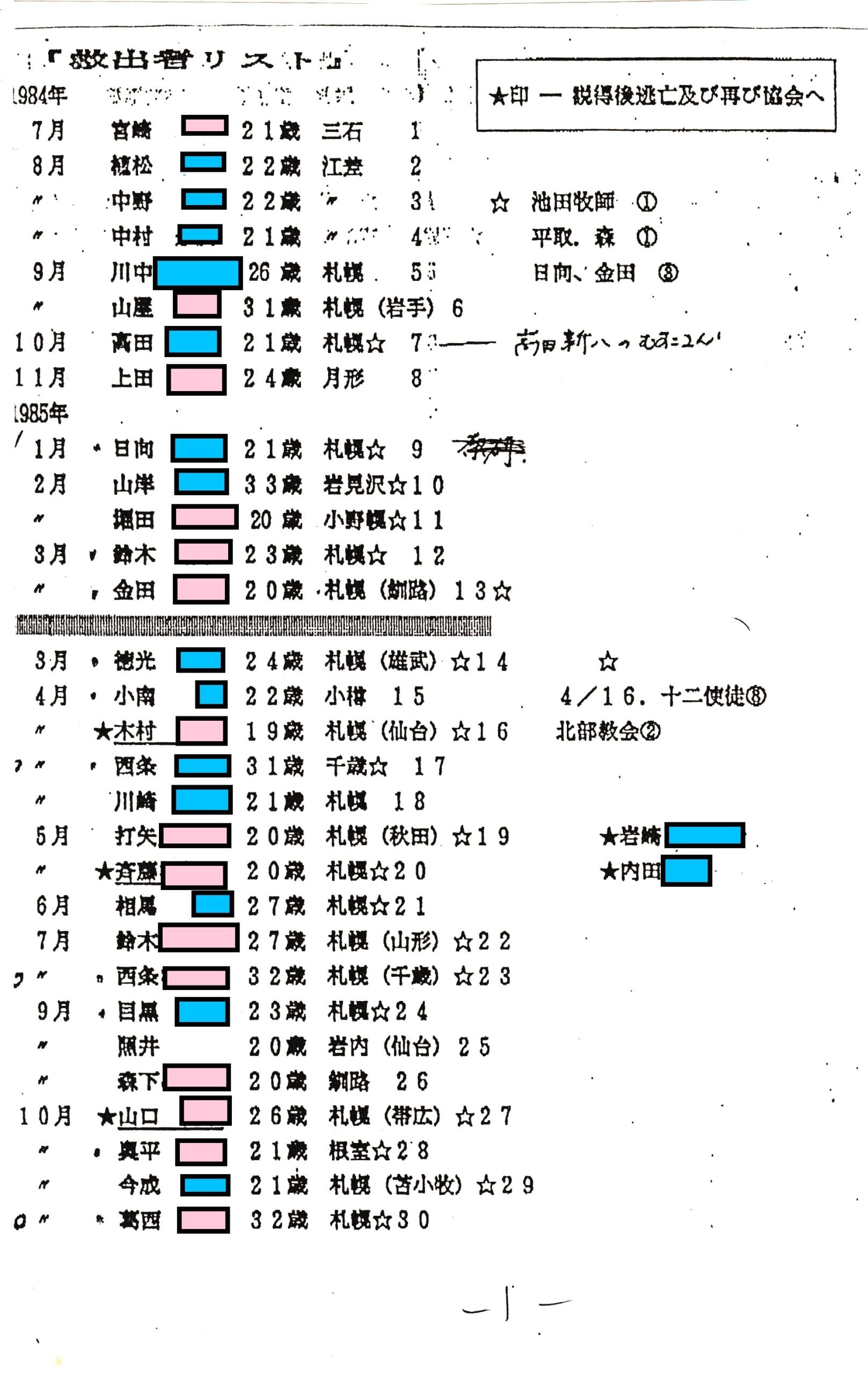 このリストには、1985年6月の部分に相馬牧師と見られる名前も記載されているため、信ぴょう性がさらに増す資料なのではないでしょうか。