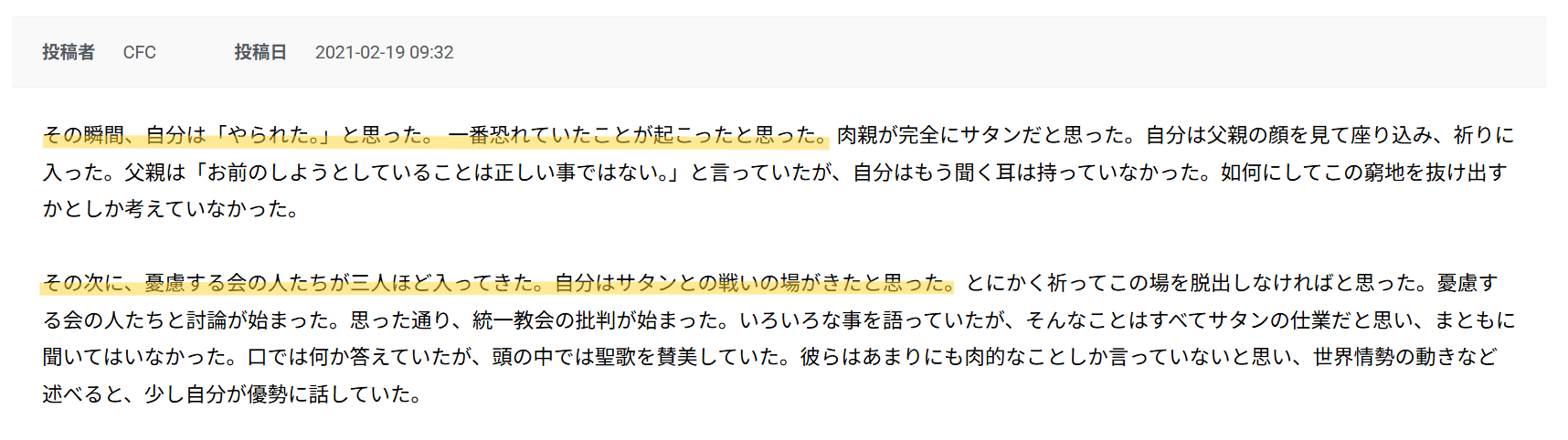 元統一教会信者で現在は京都クリスチャンフェロシップセンターの相馬浩牧師が2022年11月20に礼拝で自身が受けた統一教会に反対する脱会屋による監禁改宗体験を語ってる動画がありました。140秒におさめたのでテンポがかなりよくなってて見やすいと思う。元新体操選手の監禁もアッチでも当たり前なのね https://t.co/o1C1rHqlCI pic.twitter.com/dt2NJOvQdx