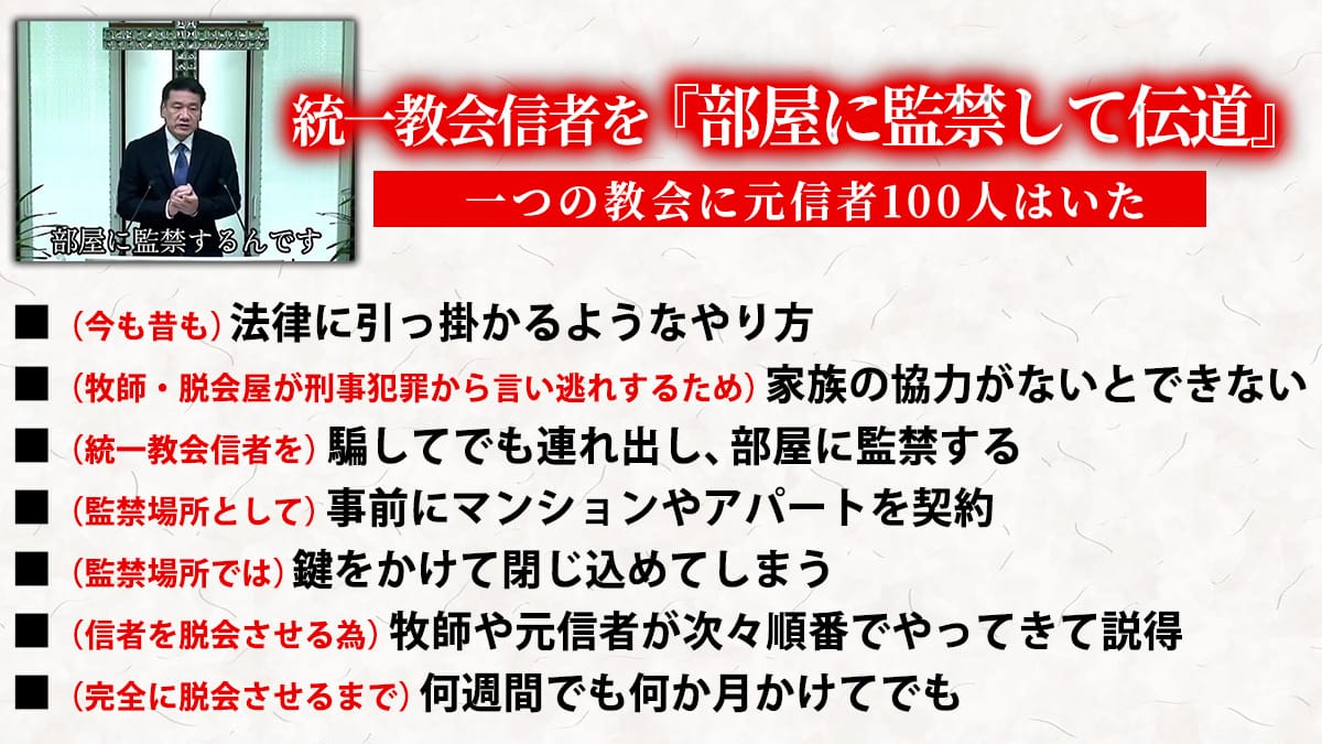 当時、親を利用し旧統一教会の青年信徒たちを脱会させ、クリスチャンの道へ進ませ自分の教会の教会員を増やしたとされていますが、動画を見てわかるとおり“ 加害者側のキリスト教関係者 ”の証言は、“被害者である統一教会信者”の拉致監禁証言と完全に一致します。