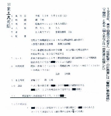 1998年、東京・昭島市で起きた「拉致監禁」の計画書には「警察に事前連絡」(下線部)とある(個人名などは一部黒塗り処理した)