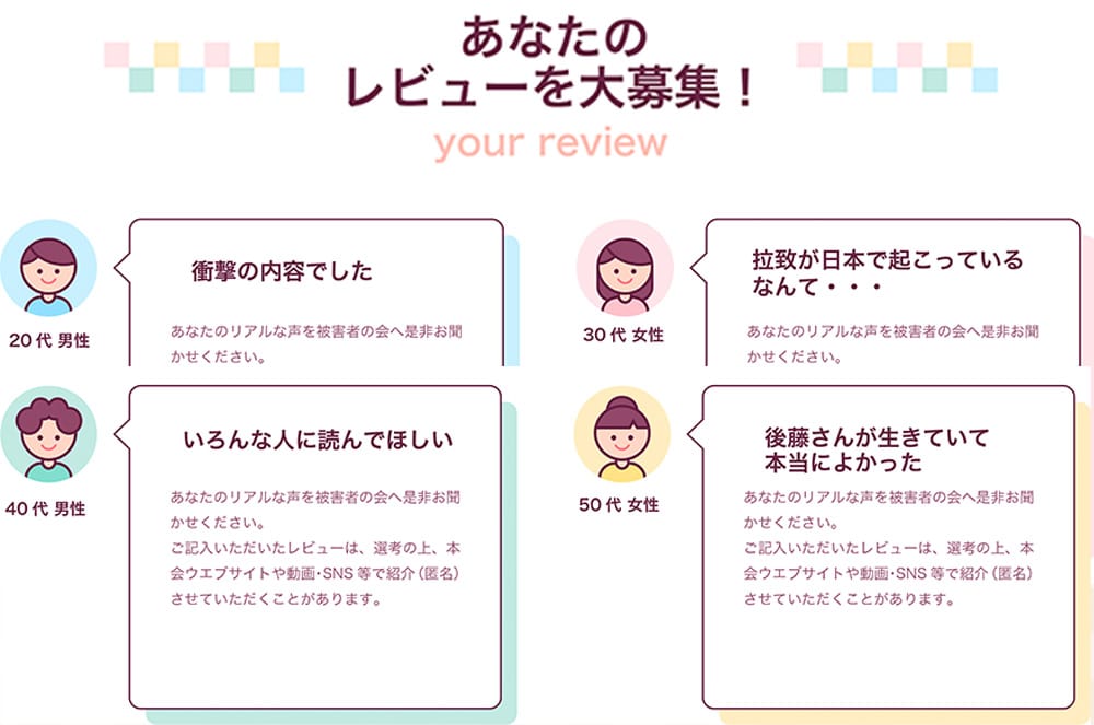 ご記入いただいたレビューは、選考の上、本会ウエブ・動画・SNS、レビューページ等で紹介(匿名)させていただくことがあります。